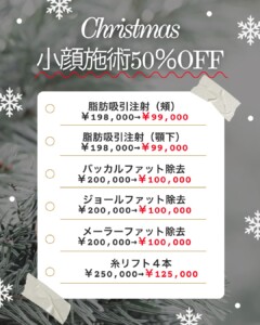 12月限定キャンペーン 小顔施術がぜ〜んぶ《50%OFF》 “今年の私、もっと可愛くなりたい…” そんな願いを叶える12月限定のご褒美キャンペーンが登場 ぽっちゃり頬・フェイスラインのお悩みに人気の脂肪吸引注射やファット除去、 さらに糸リフトまで半額で受けられる特別月 キュッと小顔で、ホリデーシーズンをもっと可愛く この機会にぜひご相談ください 【期間】12月限定 【対象施術】脂肪吸引注射/各種ファット除去/糸リフト